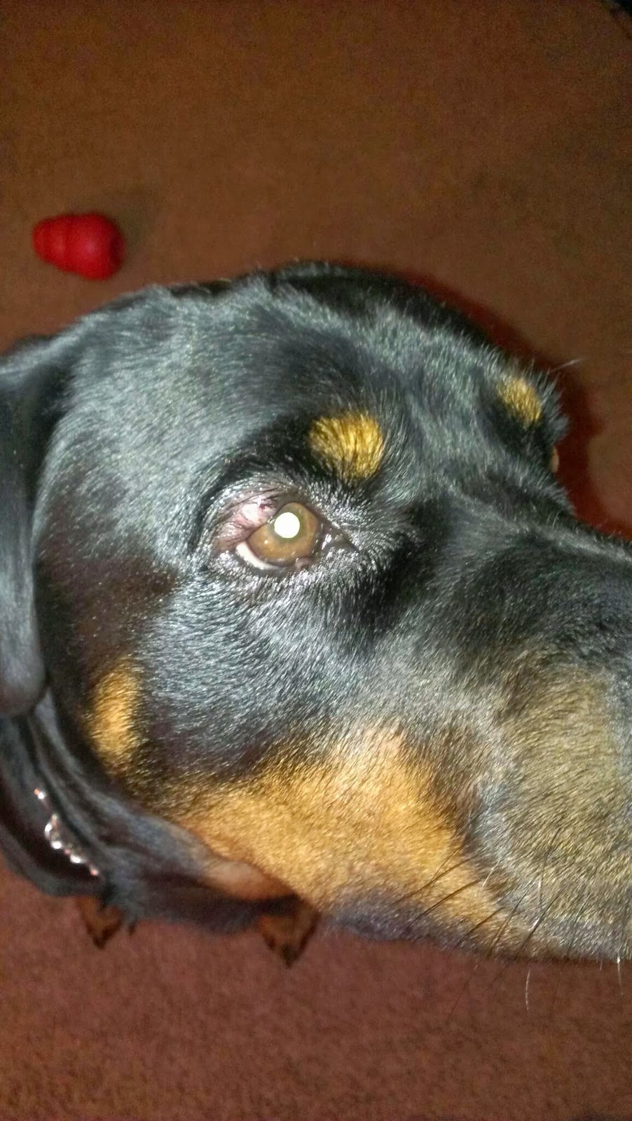 So, the first day I opened the door reluctant waiting for a smell to hit me. Instead I found Maya waiting at the door with her nub waging. Second day the same thing. By the third day I knew she was a pro and didn't expect any less then greatness, and I wasn't disappointed. By the fourth day I'm snapping pics and that's when I noticed it. Her eye was slightly swollen.